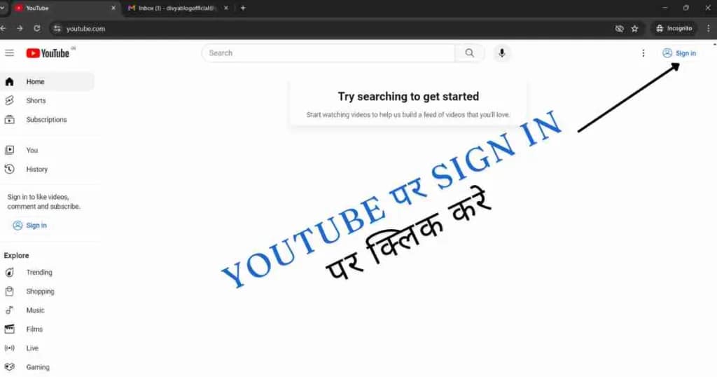 स्टेप 3: आप गूगल पर YouTube.com टाइप के सर्च करे फिर आपने जो गूगल अकाउंट बनाया है या आपके पास पहले से बना हुआ है उससे YouTube पर Sign In पर क्लिक करे।